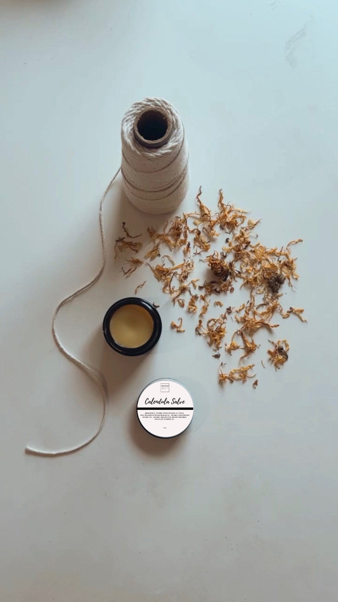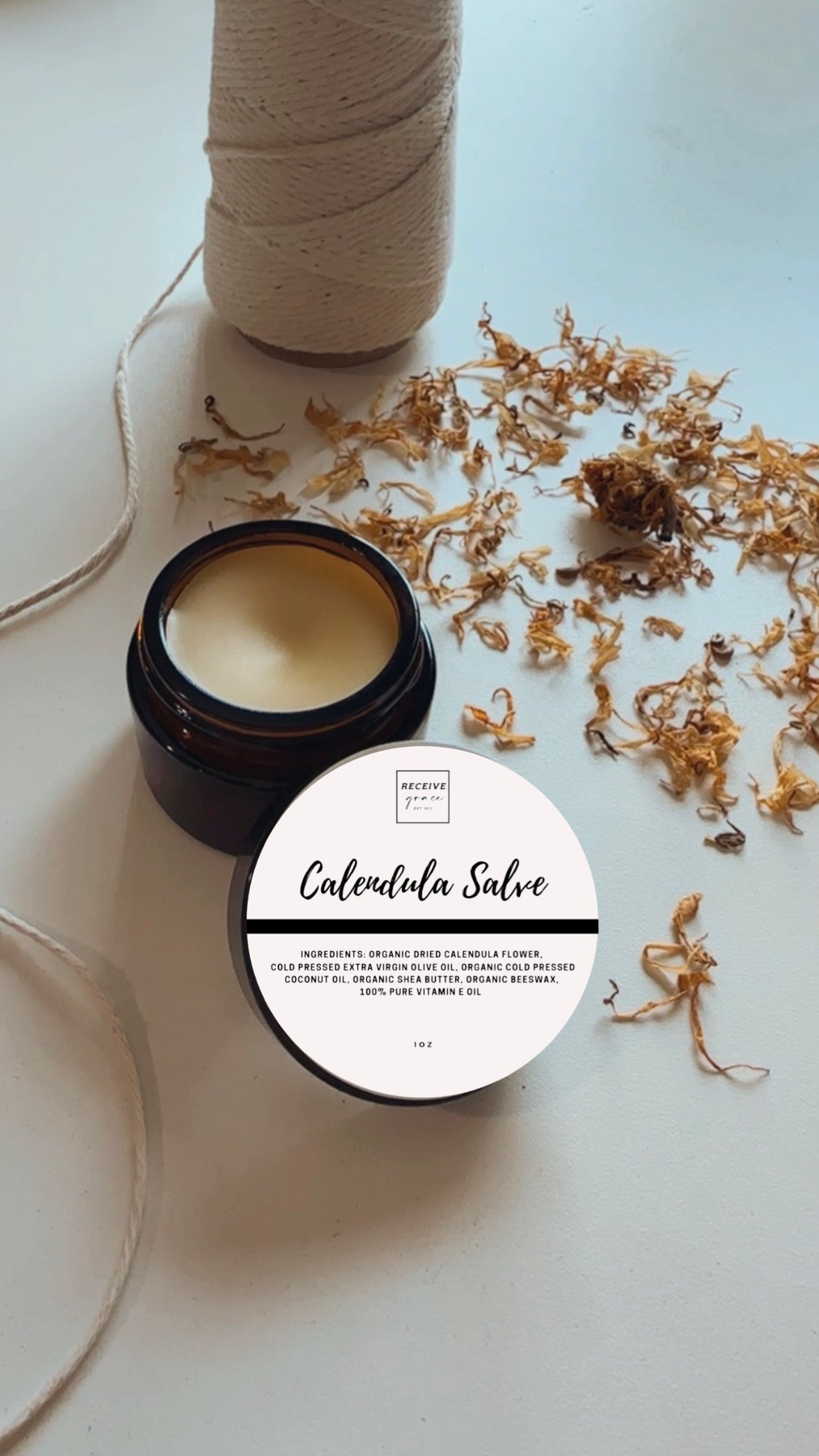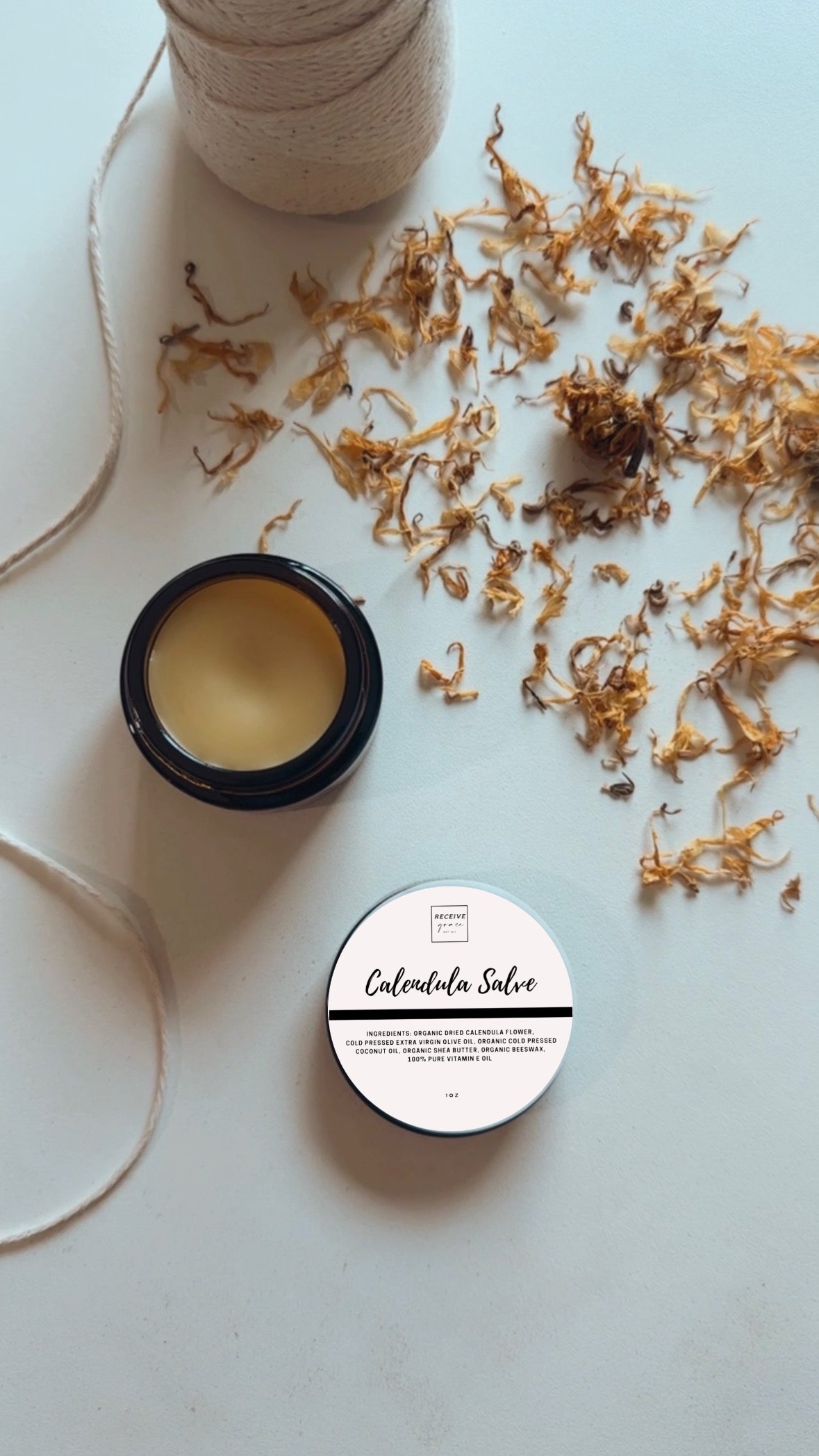 Calendula flowers, Extra Virgin Olive Oil, Extra Virgin Coconut Oil, Organic Shea Butter